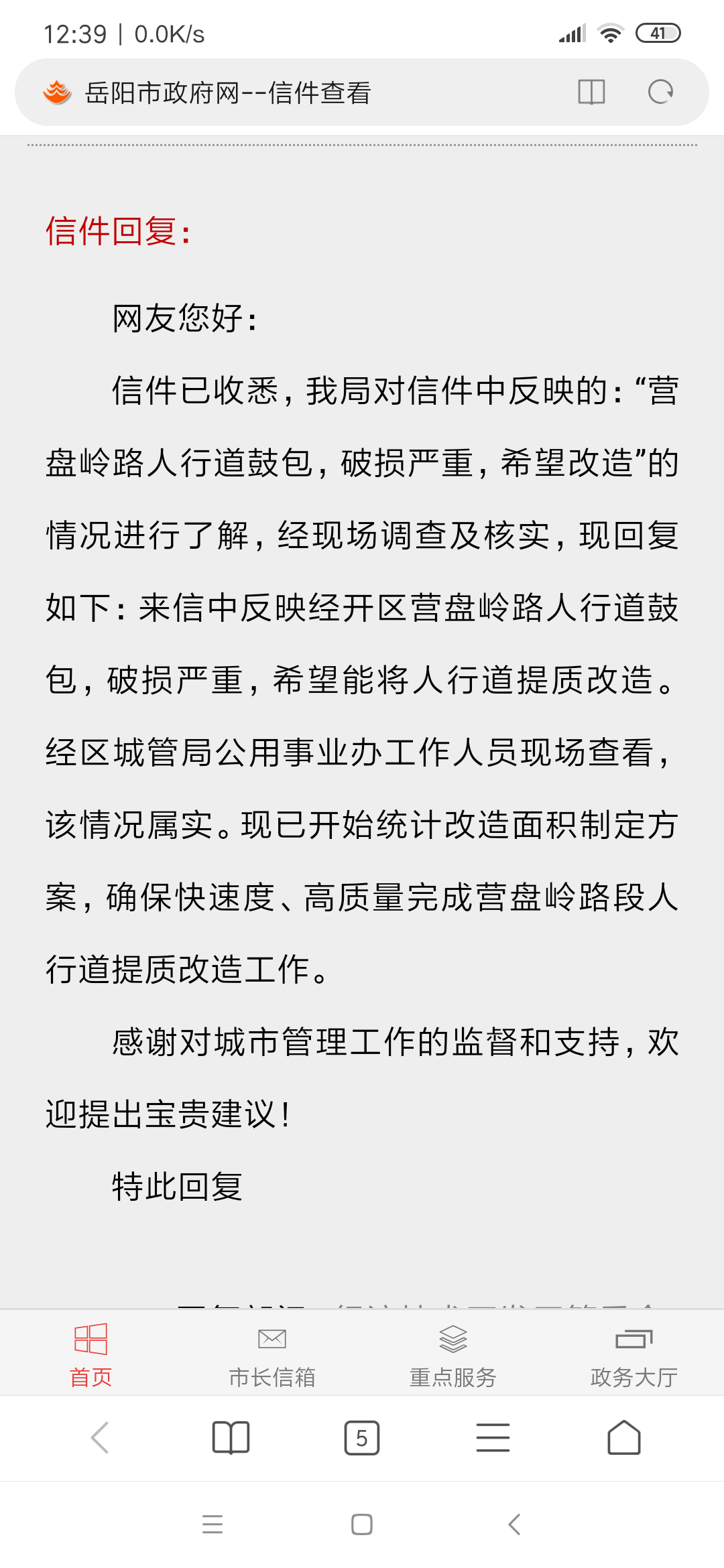 | 内容: | 关于营盘岭路人行道问题破旧坑洼鼓包等反映已过半年时间,当时政府也派员查看属实并回复加快维修更换。那么半年过去了有没有具体的动工时间,请把人行道修一修解决周边几千户居民出行问题。 附件1:Screenshot_2019-10-12-12-39-15-642_com.android.browser.png |