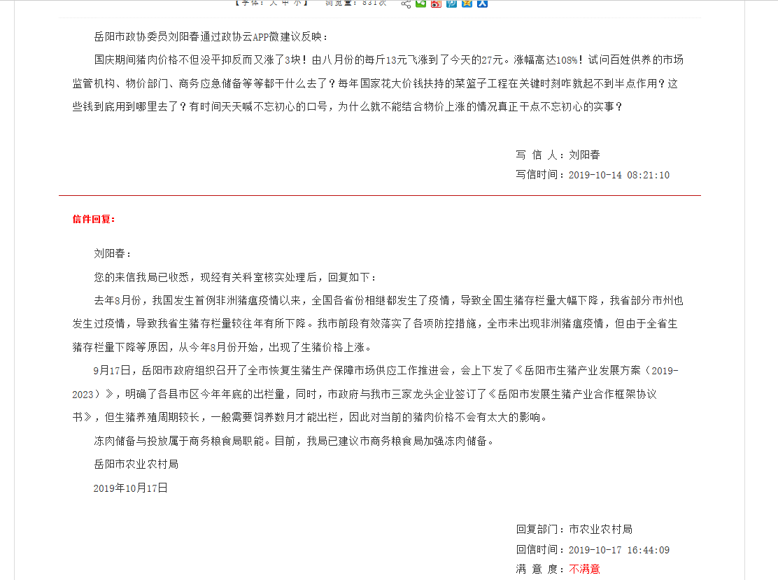 | 回复内容: | 市民朋友,您好,来信收悉。现就您关心的有关问题回复如下: 受非洲猪瘟和猪周期叠加影响,今年我市生猪产能逐月同比下滑,特别是今年8月以来,猪肉价格一路飙升,全市猪肉市场保供应工作压力持续加大。目前活体生猪收购和冷鲜肉采购两条渠道都较为通畅,全市猪肉市场供应总体基本正常。作为肉类储备管理部门,我局重点做好如下三个方面工作:一是加强市场监测。密切跟踪供求变化,关注市场动态;掌握猪肉价格走势,强化分析研判,及时发布相关信息,为市委市政府科学决策提供依据。二是加强企业指导。发挥重点屠宰企业和大型超市保猪肉供应的主渠道、主力军作用,引导企业与大中型生猪养殖基地开展产销对接,建立稳定的购销协作关系,确保有可靠的猪肉来源。三是加强应急储备。建立并完善应对非洲猪瘟保障猪肉市场供应的应急预案;加强省、市级重点储备企业日常监管,确保活体生猪和冷冻肉承储数量足额、真实、可靠;引导重点猪肉供应商,扩大肉品进口,增加冷冻肉商业储备。如遇突发情况,及时、有序组织储备肉投放,确保我市猪肉市场不发生缺肉、断供状况。 岳阳市商务粮食局 2019-10-25 |