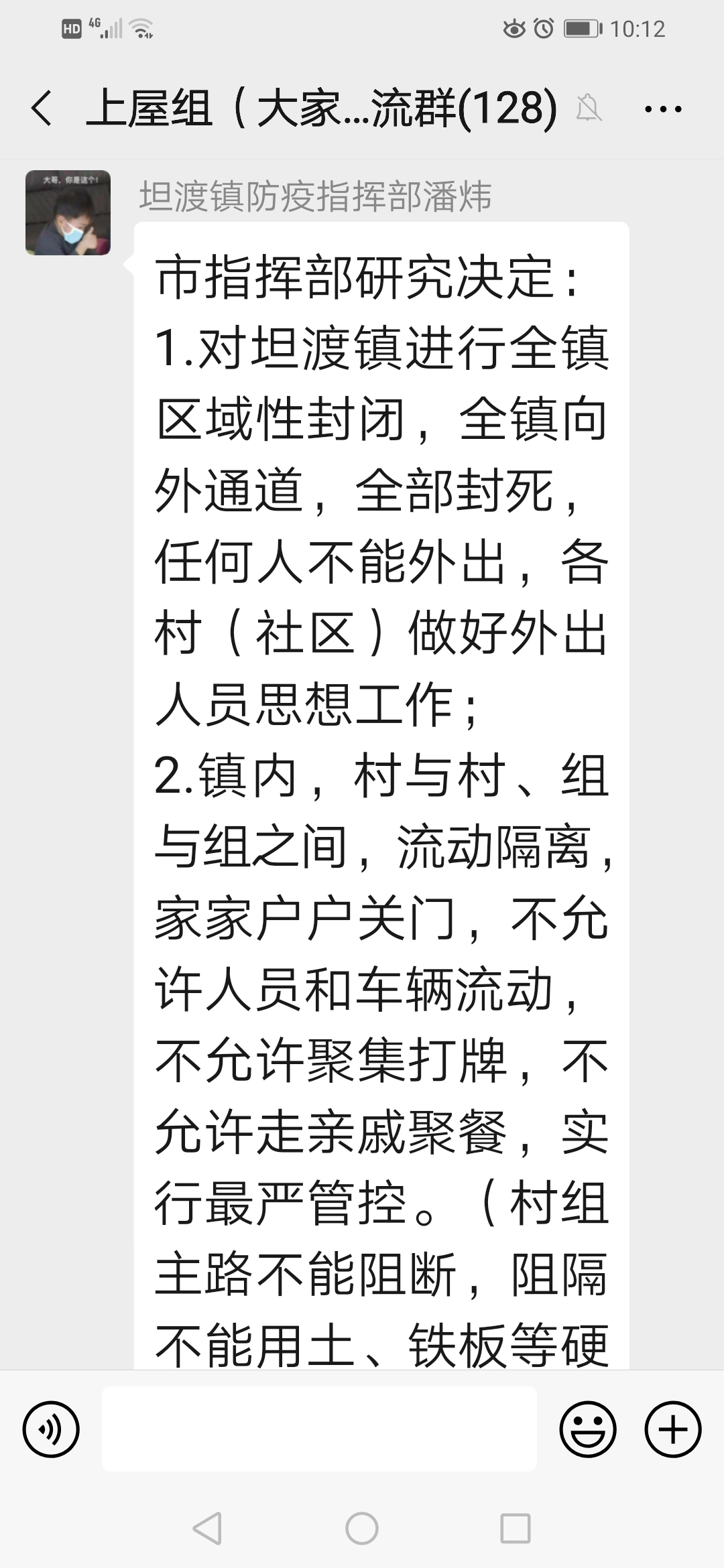 湖南省临湘市坦渡镇,共147.9平方千米,3万人口。因本镇累计发现4例确诊新型冠状肺炎,市防控指挥部口头要求全镇封锁,村组隔断,所有人员禁止外出,该通知未见盖章发文,仅微信群通知。因4人确诊,封死全镇3万人口的外出打工与对外交通。与上级政府岳阳市要求,逐步恢复交通复工复产的发文不符。现本人需回到省会长沙有急事,不用再回临湘市。建议与肺炎病例无任何接触者,政府应该允许离开本镇,不能搞全镇人口一刀切。