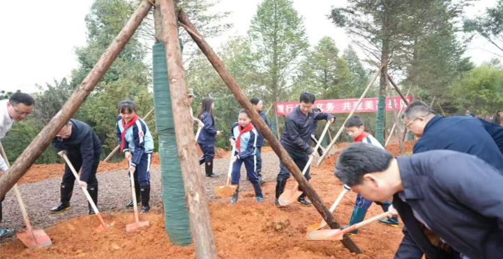 植树现场,李挚等市领导与少先队员一起,挥锹铲土、培土围堰、提水浇灌,合力栽下黄枝油杉、红豆杉等苗木。植树间隙,李挚等市领导向有关负责同志详细了解苗木品种、植物保护和全民义务植树等情况,指出要深入学习贯彻习近平生态文明思想,牢固树立“绿水青山就是金山银山”的理念,持续推动全民义务植树走深走实,让爱绿、植绿、护绿、兴绿在全社会蔚然成风。